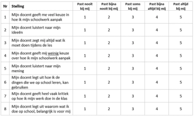 Deze korte vragenlijst meet in hoeverre leerlingen de vrijheid ervaren om zelf keuzes te mogen maken in hun schoolwerk én daarin gesteund worden door de docent. Voorbeelden van stellingen uit deze vragenlijst zijn: ‘Mijn docent geeft me veel keuze in hoe ik mijn schoolwerk aanpak’ en ‘Mijn docent luistert naar mijn ideeën’.