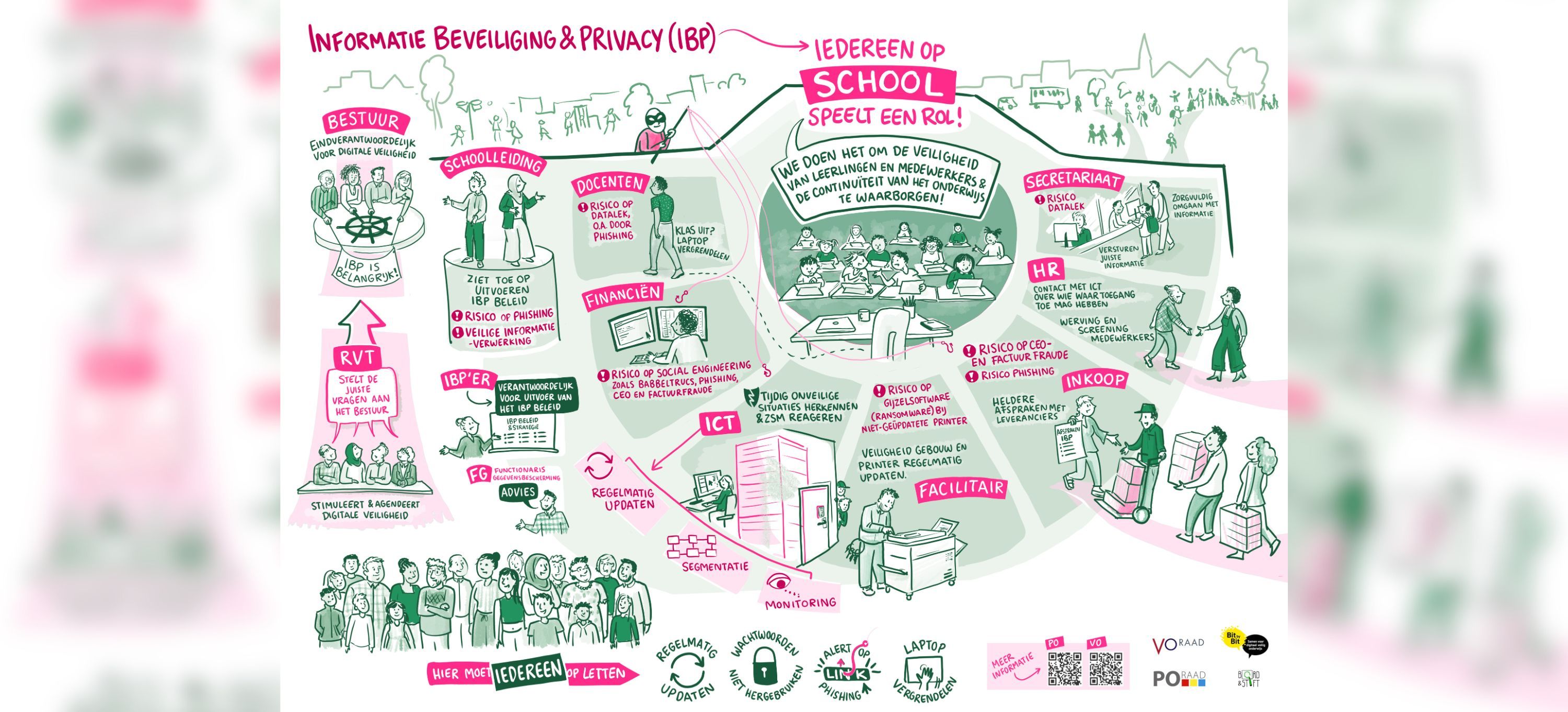 Maar niet alleen bestuurders zijn verantwoordelijk. Het op orde krijgen van de IBP vraagt inzet van de hele organisatie. Iedere medewerker speelt een rol in het realiseren van een digitaal veilige leer- en werkomgeving. Ben je benieuwd naar de verantwoordelijkheden die bij jouw rol horen? In deze praatplaat krijg je een overzicht van wat jij vanuit jouw rol kan bijdragen aan digitaal veilig onderwijs.