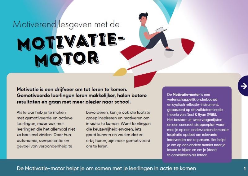Motivatie, en de onderliggende aspecten autonomie, competentie en verbondenheid, zijn belangrijke voorspellers van de succesvolle ontwikkeling van onze leerlingen. Gemotiveerde leerlingen leren makkelijker, halen betere resultaten en gaan met meer plezier naar school. De Motivatie-motor is een wetenschappelijk onderbouwd en cyclisch reflectie-instrument dat leraren kan helpen om aan de juiste knoppen te draaien zodat leerlingen (meer) gemotiveerd raken om te leren.