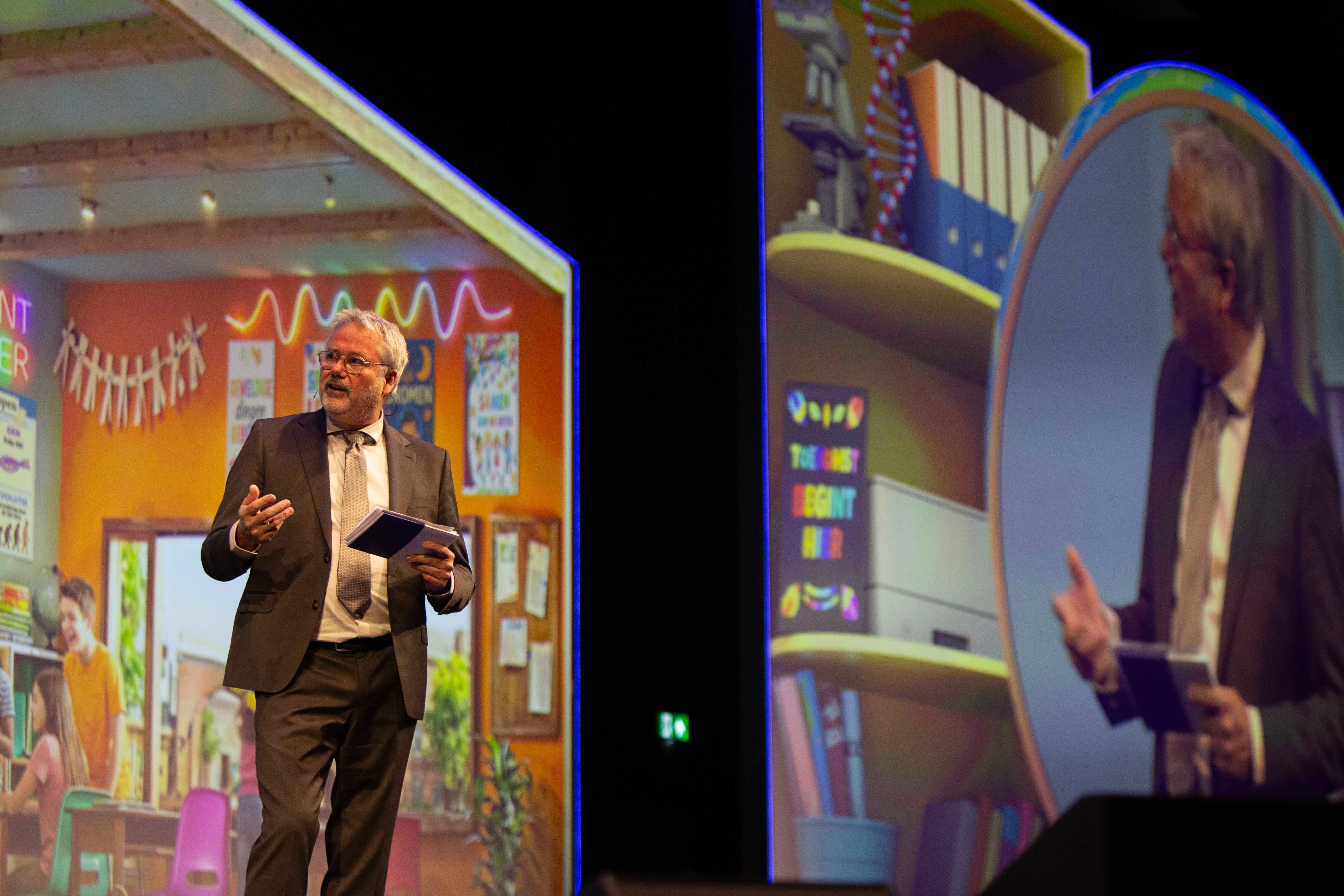 Hier ligt een verantwoordelijkheid voor schoolbestuurders en schoolleiders, benadrukte Henk Hagoort tijdens de opening. Bart Götte sloot hier in zijn keynote op aan: er zijn leiders nodig die niet krampachtig vasthouden aan het oude en/of wegkijken van verandering, maar die in actie komen en offervaardig zijn; bereid zijn om zelf iets op te offeren om een stap verder te komen. Het sleutelwoord hierbij is ‘samen’, aldus Bart. Hij benadrukte: we hebben elkaar echt nodig; geen enkeling heeft alle kennis of het hele antwoord. Juist door samen te zoeken, te proberen en te leren kunnen scholen antwoorden vinden op de vraag hoe met de veranderingen - en bijbehorende problematiek - om te gaan, zodat leerlingen ook in de toekomst goed onderwijs in een veilige schoolomgeving blijven krijgen.
