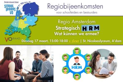 Regio Amsterdam organiseert op dinsdag 17 maart 2026 een regiobijeenkomst op het St. Nicolaaslyceum in Amsterdam over het thema Strategisch HRM - van 15:00 tot 18:00 uur met aansluitend diner. De verdere inhoud van het programma wordt later bekend gemaakt. Aanmelden is al mogelijk!