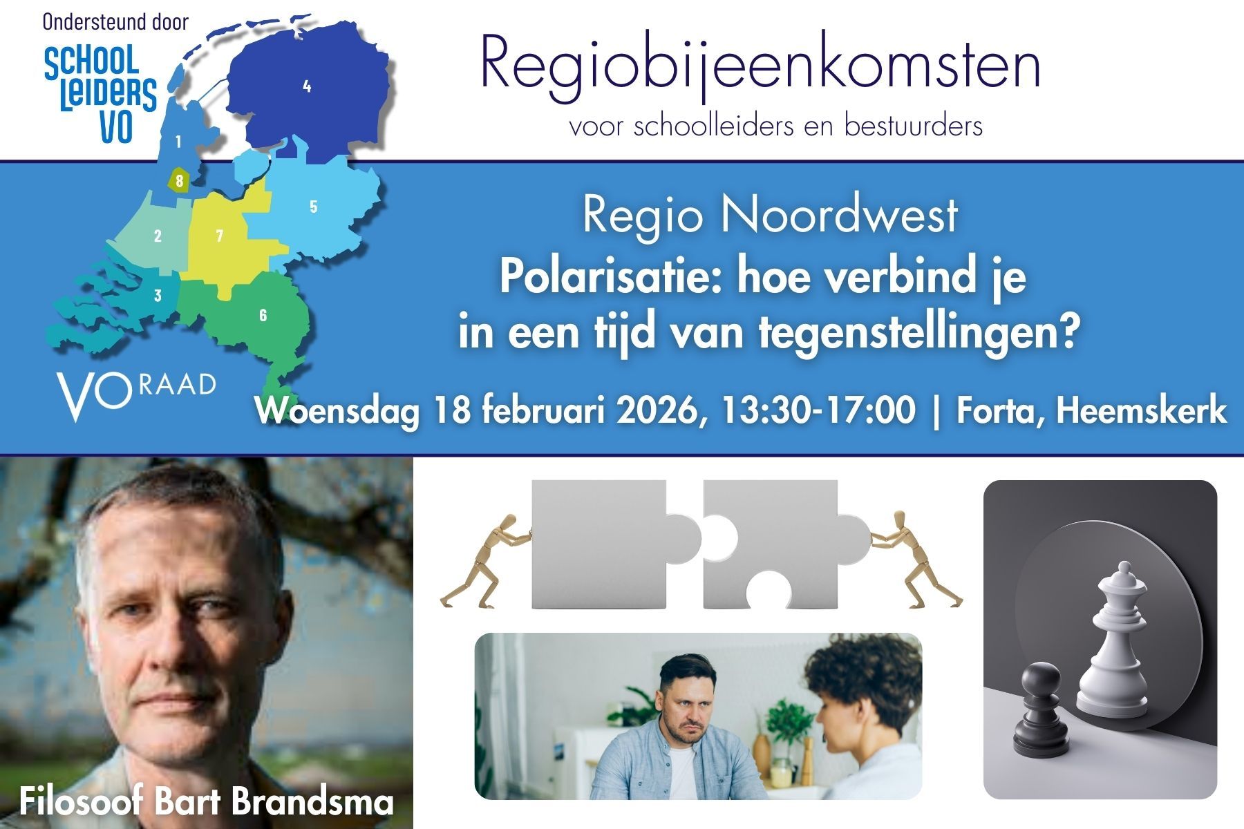 Deze regiobijeenkomst gaan we het hebben over polarisatie: wat zijn de effecten daarvan op school en wat is de positie van de schoolleider hierin? We kijken naar de buitenwereld, onze leerlingen, maar ook wat de dynamiek intern (in de docentenkamer) met ons doet. Hoe komen we tot de juiste rolverdeling binnen de school en hoe geef je zelf op de juiste manier richting? Na de bijeenkomst kijk je nooit meer op dezelfde manier naar het fenomeen polarisatie: je ziet waar het goed kan doen én wanneer het vraagt om ‘ingrijpen’!