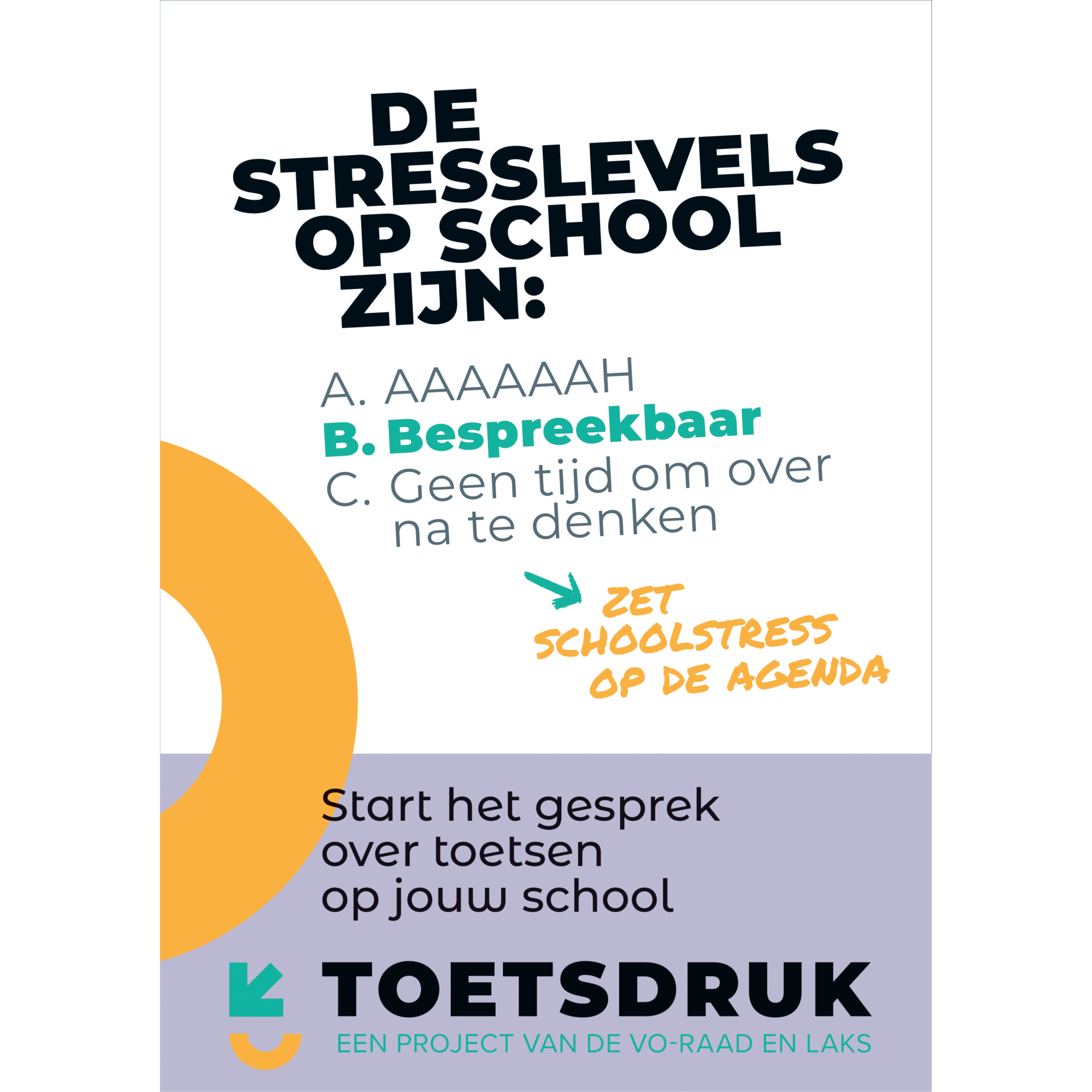 Deze week start de campagne van project Toetsdruk waarin aandacht wordt gevraagd voor schoolstress. Ruim twee op de vijf leerlingen ervaren dagelijks stress door school: van het continu checken van cijfers tot de druk om steeds te presteren. Maar wist je dat jij – samen met je school – invloed hebt op de ervaren druk? Dat start met een goed gesprek tussen leerlingen en de school. Project Toetsdruk zet de komende maanden in op het activeren van het gesprek hierover op scholen.