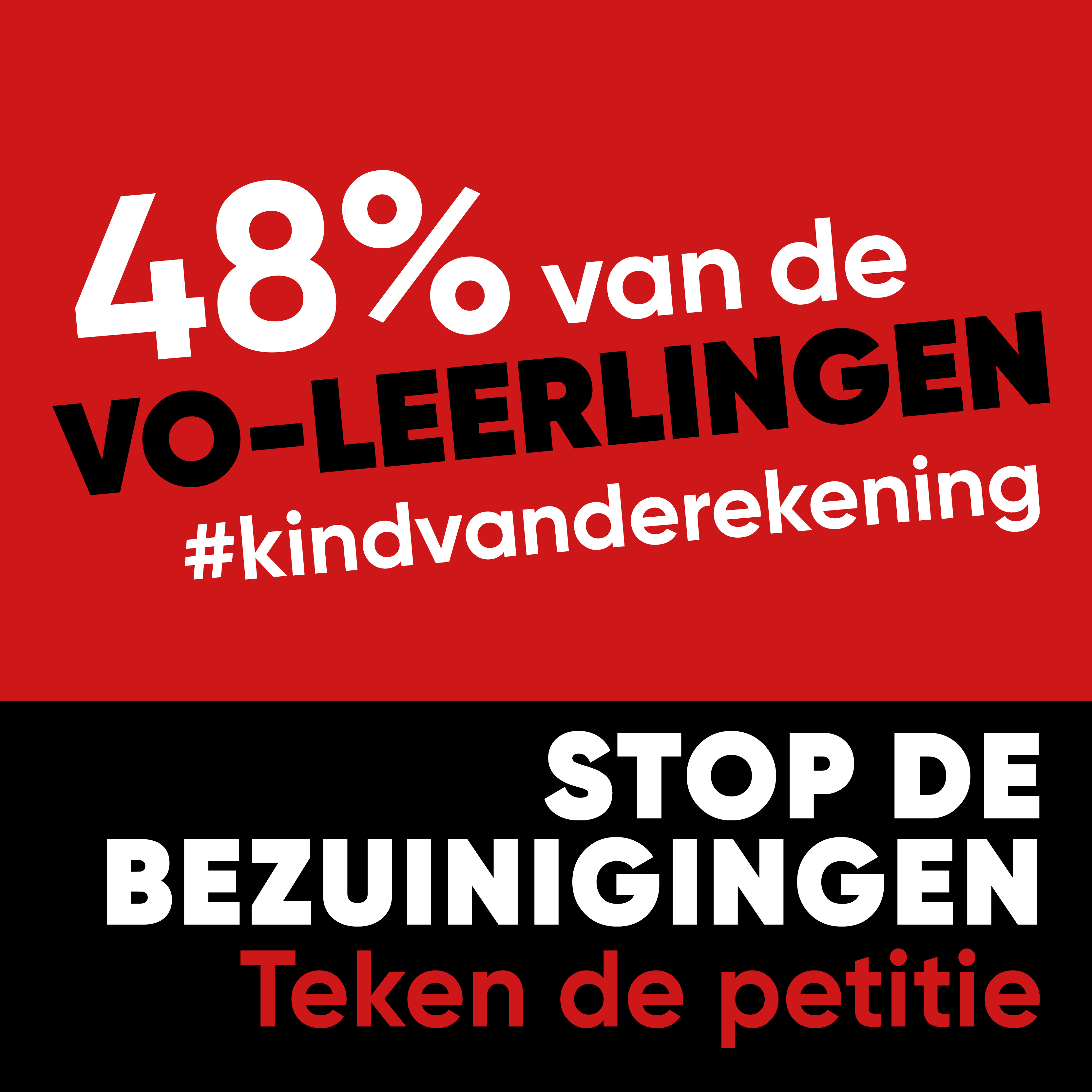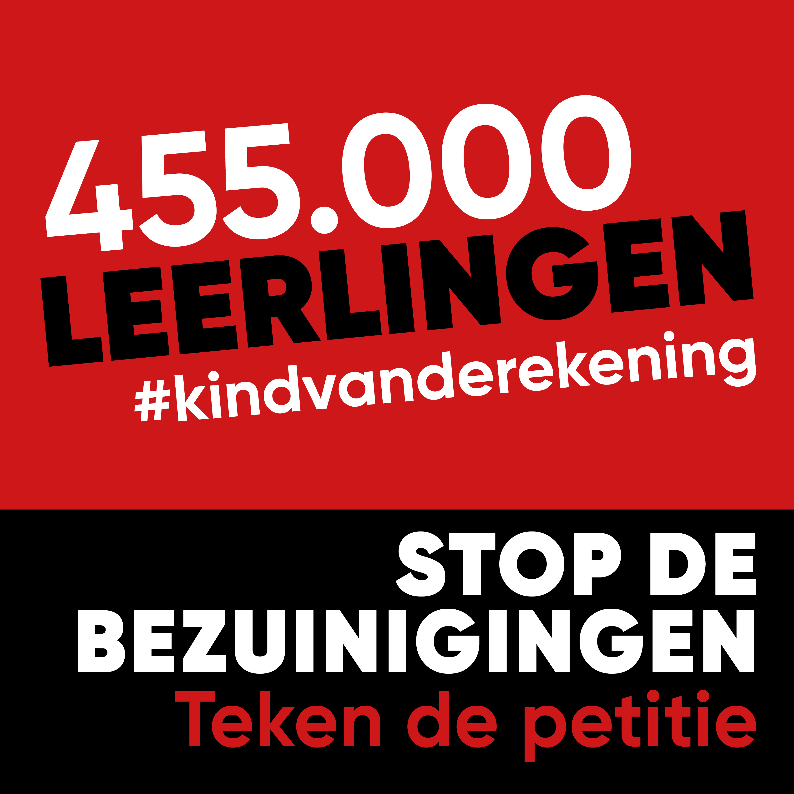 Op 20 mei startte de campagne “455.000 leerlingen #kindvanderekening – stop de bezuinigingen op onderwijs”. De bezuinigingen raken de leerlingen die het hardst ondersteuning nodig hebben. Daarom staan we voor hen op om deze bezuinigingen te stoppen. Dat doet de VO-raad gezamenlijk met de sociale partners en andere partijen met een petitie en verschillende acties. Wil jij ook meehelpen? We hebben diverse campagnematerialen ontwikkeld dat je kunt gebruiken om de campagne onder de aandacht te brengen.