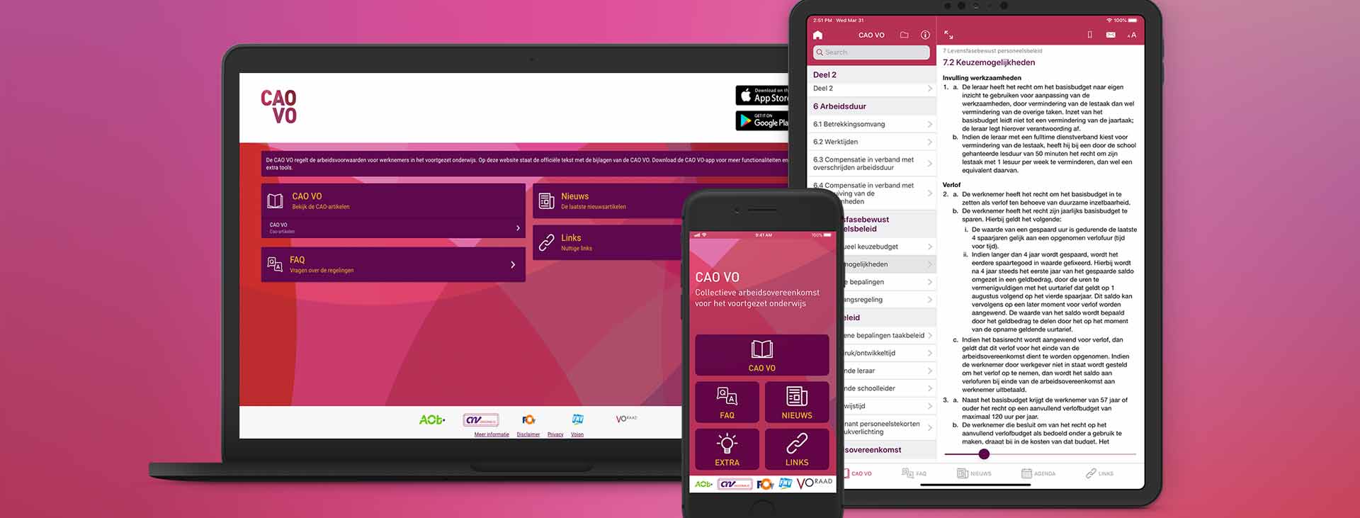 Voion heeft in opdracht van de sociale partners een app laten ontwikkelen voor de CAO VO. Hierin staat de tekst van de cao en heel veel extra informatie hierover. De cao is eenvoudig te doorzoeken en u kunt veel gestelde vragen en antwoorden lezen over gerelateerde onderwerpen. De app is gebruiksvriendelijk en kosteloos.