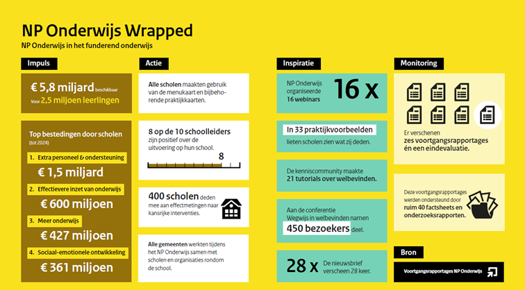 Het Nationaal Programma Onderwijs is in het voorjaar van 2021 gelanceerd met als doel de gevolgen van de pandemie op het gebied van leervertragingen, welbevinden én kansengelijkheid in het onderwijs zoveel mogelijk op te vangen. Van de beschikbare 5,8 miljard voor het funderend onderwijs ontvingen scholen ruim 4 miljard in de vorm van aanvullende bekostiging. Ook gemeenten kregen middelen om voor kinderen en jongeren extra activiteiten te organiseren. Daarnaast werden nieuwe subsidieregelingen geïntroduceerd, zoals de arbeidsmarkttoelage en een subsidie voor heterogene brugklassen. Na ruim vier jaar kunnen we concluderen dat de meeste doelen van het programma zijn gerealiseerd.