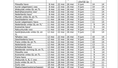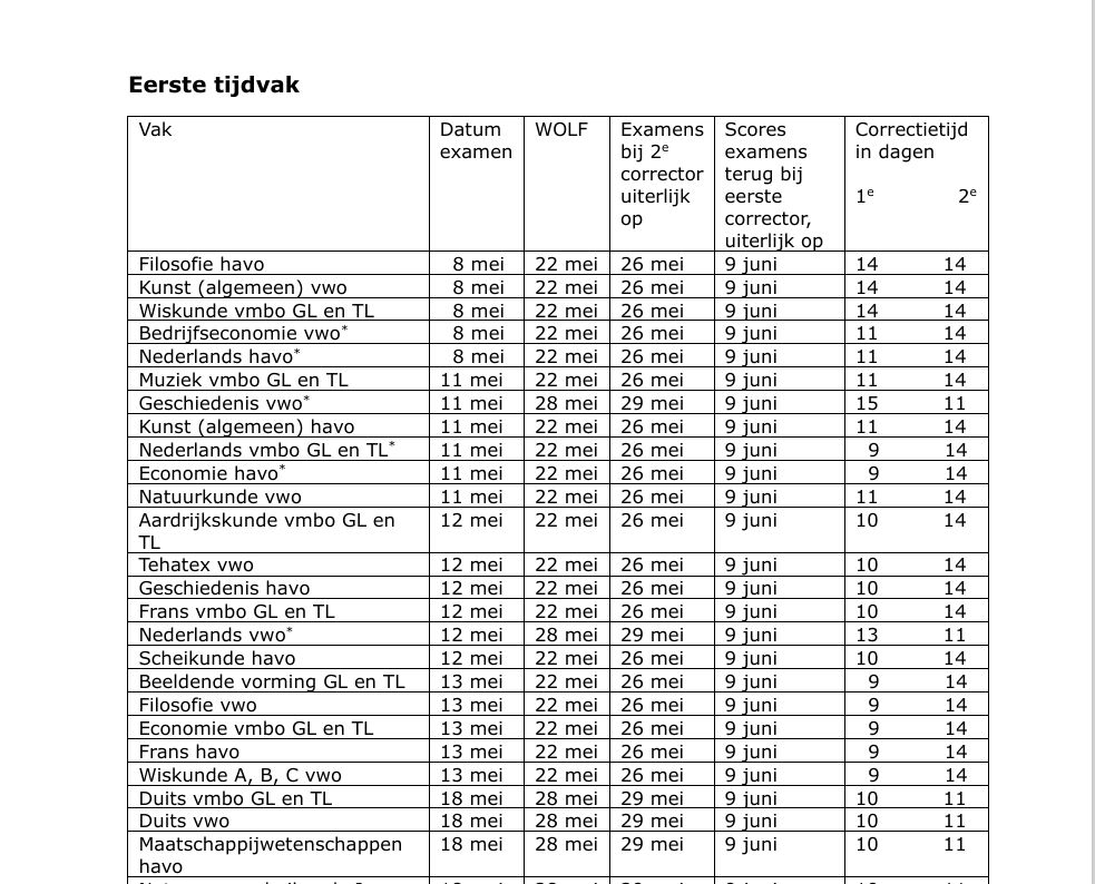 Van groot belang zijn maatregelen om de beschikbare correctietijd voor docenten zo goed mogelijk te gebruiken. Hier ligt een rol voor alle betrokkenen, van bevoegd gezag tot schoolleiding en docenten. In overleg met diverse partijen is weer een adviestabel 'Opsturen examenwerk naar eerste en tweede corrector' opgesteld door FvOv. Hierin staat per vak en examen aangegeven op welke dag de examens binnen zouden moeten zijn bij de tweede en weer terug bij de eerste corrector, om te bereiken dat de nakijktijd zoveel mogelijk geoptimaliseerd is. Sinds vorig jaar is de adviestabel aangevuld met een advies voor het tweede tijdvak. Gebruik ervan wordt sterk aangeraden.