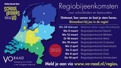 Wil je ook een keer een regiobijeenkomst bezoeken? Inmiddels zijn de data van de regiobijeenkomsten in voorjaar 2025 bekend. Meld je aan op www.vo-raad.nl/regios, graag tot dan!