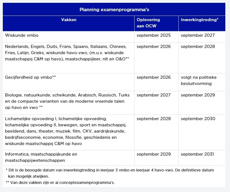 SLO heeft een planning gemaakt rondom de invoering van de herziene kerndoelen en examenprogramma's. Bekijk het volledige overzicht op hun website. Om integrale schoolontwikkeling op te pakken met het implementeren van de kerndoelen, is het nodig dat scholen zo snel mogelijk aan de slag gaan.