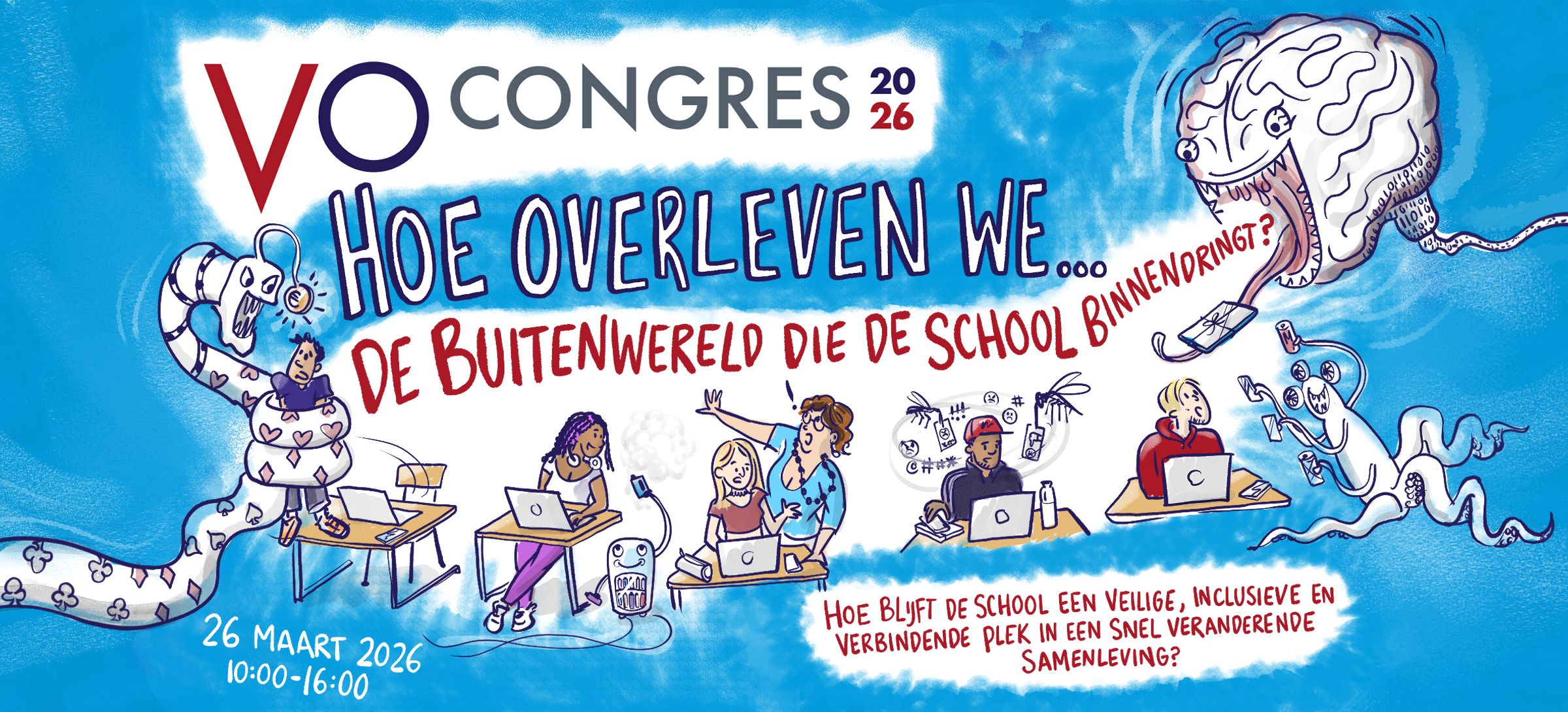 Op donderdag 26 maart 2026 is het zover: het jaarlijkse VO-congres! Dit jaar staat in het teken van een urgent thema: Hoe blijft de school een veilige, inclusieve en verbindende plek in een snel veranderende samenleving? Onder de titel “Hoe overleven we… de buitenwereld die de school binnendringt” onderzoeken we hoe scholen koers houden in een wereld waarin maatschappelijke spanningen, social media, straatcultuur en polarisatie vaker de school binnenkomen.