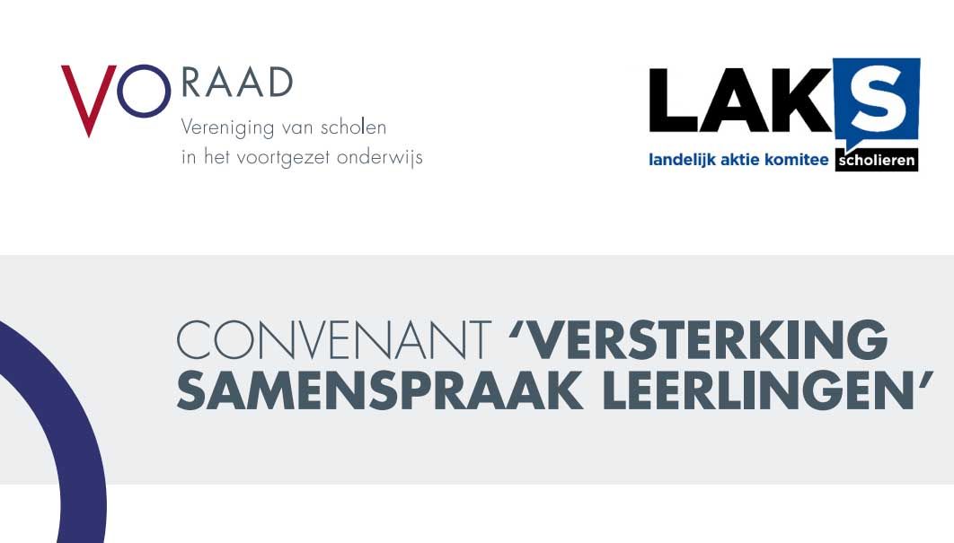 In het convenant ‘Versterking samenspraak leerlingen’ vinden scholen en leerlingen een aantal uitgangspunten voor het goed organiseren van de leerlingenparticipatie, alsook afspraken over de plichten van scholen en rechten van leerlingen op dit vlak. In juni 2021 sloten de VO-raad en LAKS een vernieuwde versie van het convenant af.