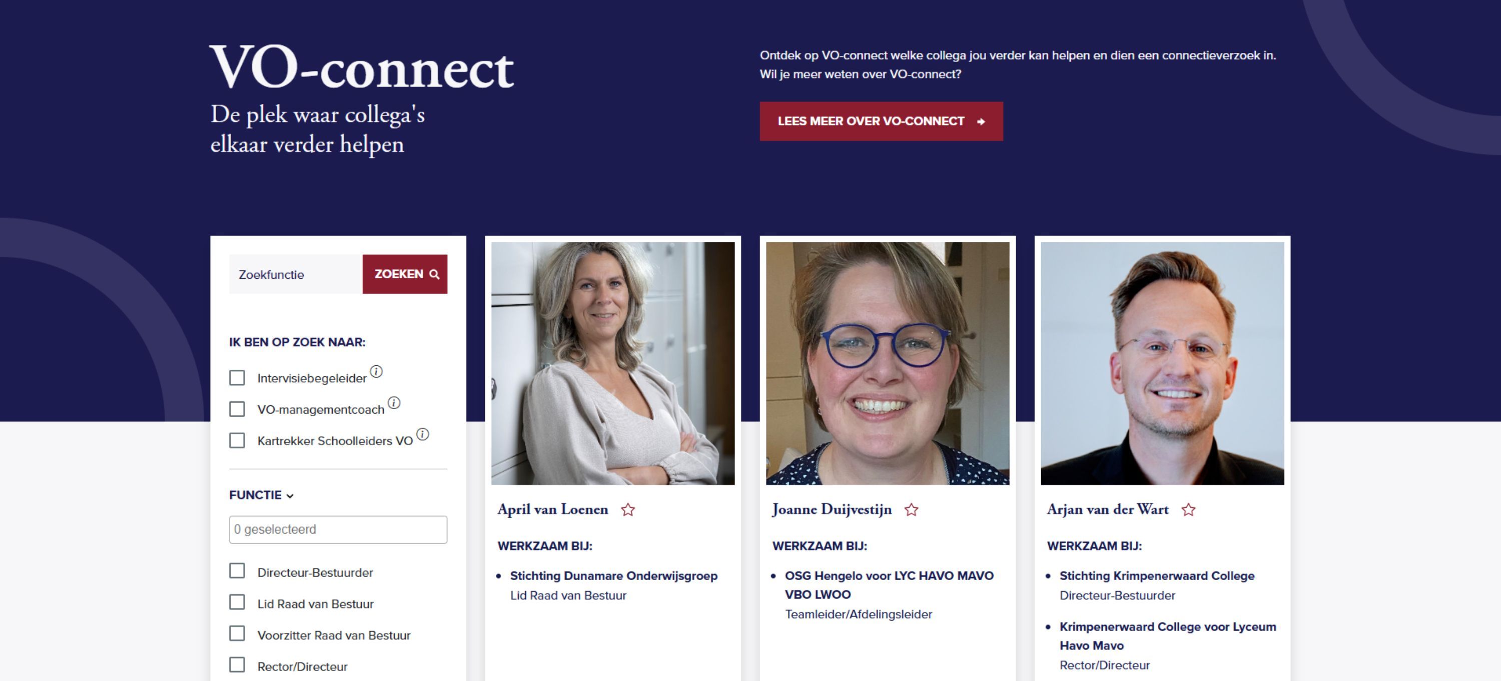 VO-connect is een dienst binnen de Mijn VO-raad omgeving waar schoolleiders en bestuurders met elkaar in contact kunnen komen. Op VO-connect vind je momenteel profielen van schoolleiders (van teamleider tot rector) en bestuurders die gecertificeerd zijn als VO-managementcoach en/of intervisiebegeleider. Daarnaast vind je de schoolleiders die actief zijn bij Schoolleiders VO. Zij stellen hun kennis en tijd beschikbaar om de sector als geheel en jou als individu te versterken.
